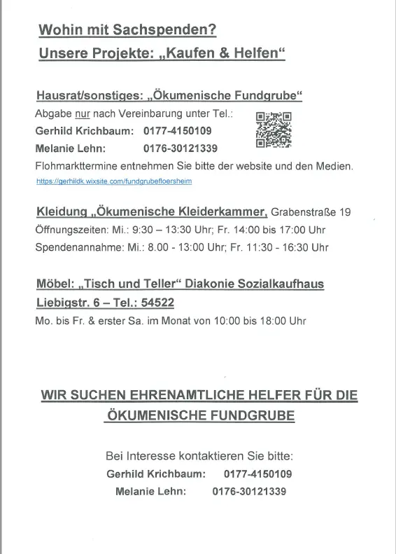 Die Ökumenische Fundgrube veranstaltet regelmäßig Flohmärkteim Ev. Gemeindezentrum Flörsheim, Erzbergerstr. 13a. Im Angebot sind Gemälde, Geschirr, Gläser, Hausrat und Elektroartikel sowie Spielsachen und alles, was uns an Gegenständen aus Haushalten gespendet wird. Der Verkaufserlös fließt zu 100% in soziale und kirchliche Projekte.