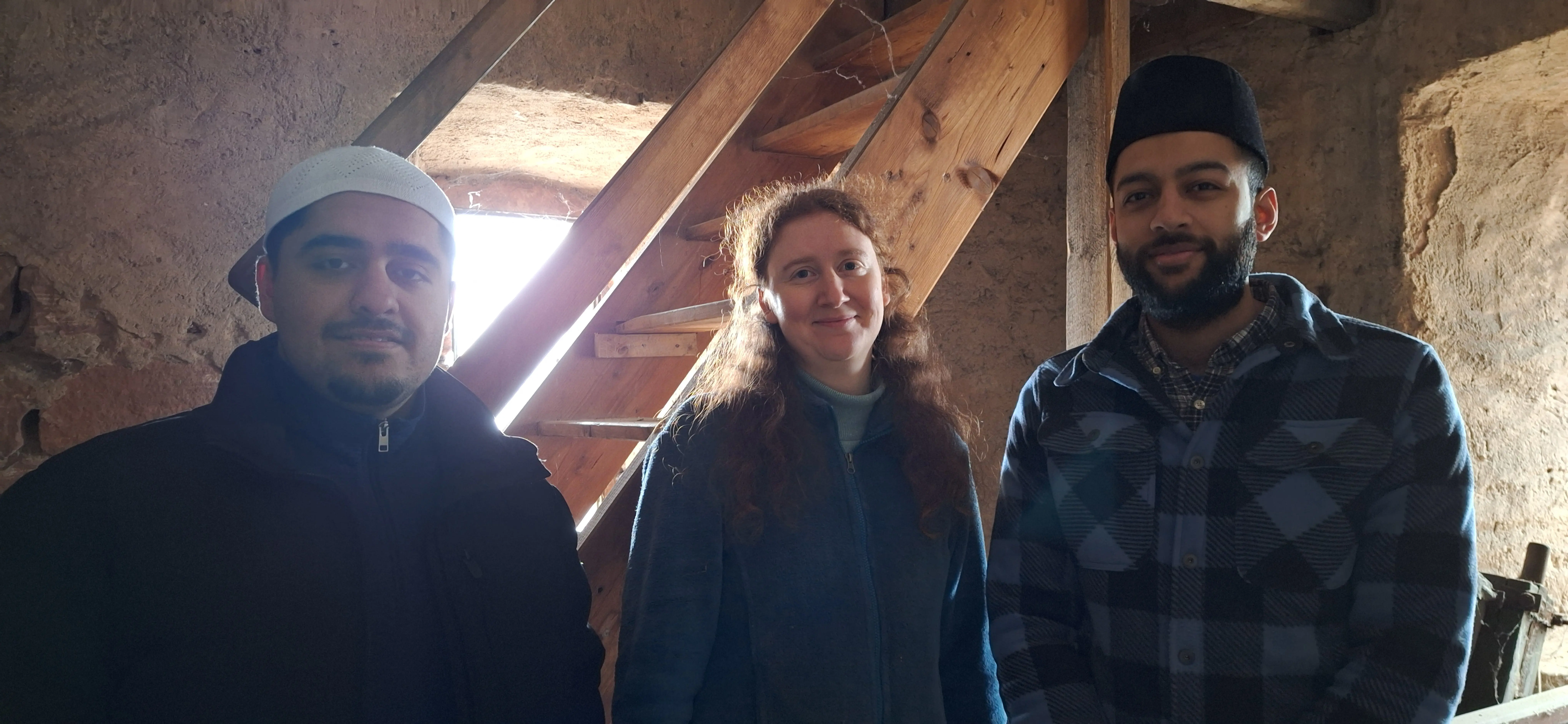 (c) Ev.Kirchengemeinde FlörsheimFebruar 2026: Besuch aus der Ahmadiyya-Muslim-Gemeinde in der Altkönigsstraße: Küsterin Esther Ilka-Konrad und Pfarrerin Klodt freuen sich, dass Imam Sajeel Ahmad und Faizan Latif sich unsere Kirchenglocken anschauen wollen und dafür hoch in den Glockenturm steigen.